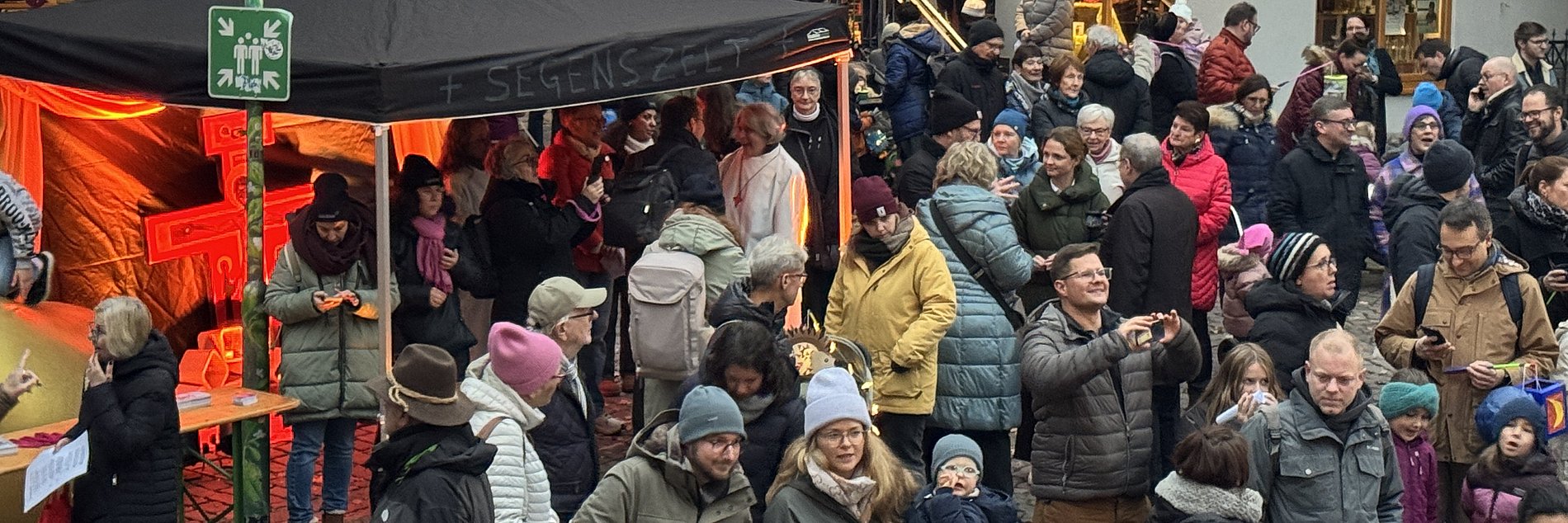 Weiter ging es zum Regionenstand auf dem Markt am Löherplatz, wo Pfarrer Kirsten Brast von der Pfarrei St. Martin Idsteiner Land und die Pfarrgemeinderatsvorsitzende Dr. Alexia Schadow sowie zahlreiche Idsteiner Bürgerinnen und Bürger und Interessierte die Gelegenheit nutzten, mit dem Bischof aber auch der Bischöflichen Bevollmächtigten, Prof. Dr. Hildegard Wustmanns, ins Gespräch zu kommen. Kärtchen auf den Stehtischen regten zum Nachdenken an: „Woraus schöpfst du Hoffnung?“, „Wie kannst du Hoffnung teilen?“ und „Welche Hoffnung verbindest du mit der neuen Katholischen Region?“ Viele Besucherinnen und Besucher schrieben ihre Antworten auf und hängten sie an eine Leine – ein sichtbares Zeichen des Austauschs und der Verbundenheit.